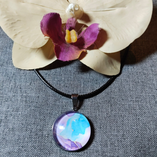Halskette mit Lederband verstellbar (von Länge 45-50cm), Anhänger aus einem Edelstahl-Rohling mit schönen Motiv und Kuppel-Glascabochons, Größe des Anhängers 20mm.