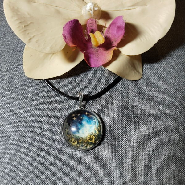 Halskette mit Lederband verstellbar (von Länge 45-50cm), Anhänger aus einem Edelstahl-Rohling mit schönen Motiv und Kuppel-Glascabochons, Größe des Anhängers 20mm.