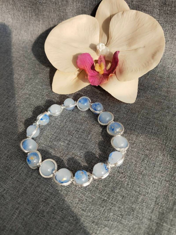 Hergestellt aus Glasperlen mit dehnbarer Nylonschnur, passt auf jede Hand, ergänzt sowohl lässige als auch Abschlussball-Partys mühelos, Perlengröße 8mm, Perlenumrandung aus versilberten Edelstahl.