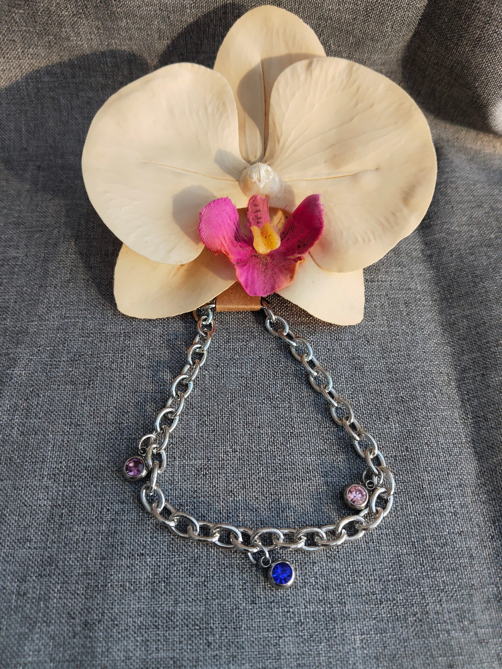 Bettelarmband mit 3 kleinen Anhängern (dunkelblau, lila, rosa), Armband aus Eisen versilbert 18cm.