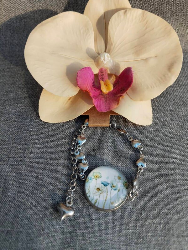 Armbänder bestehen aus Edelstahl versilbert, Länge einstellbar von 14-19 cm, liebe Herzformen, Fassung aus Edelstahl 20mm mit Motiven und Glascabochons.