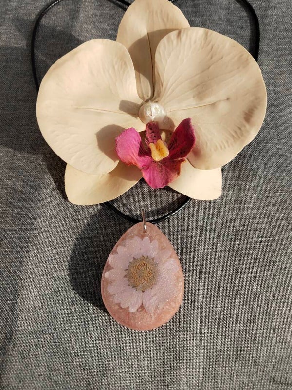Halskette mit Lederband, Länge verstellbar von 45-50cm, Anhänger groß aus Harz gegossen, schimmernd zart rosa mit getrockneter Blume.