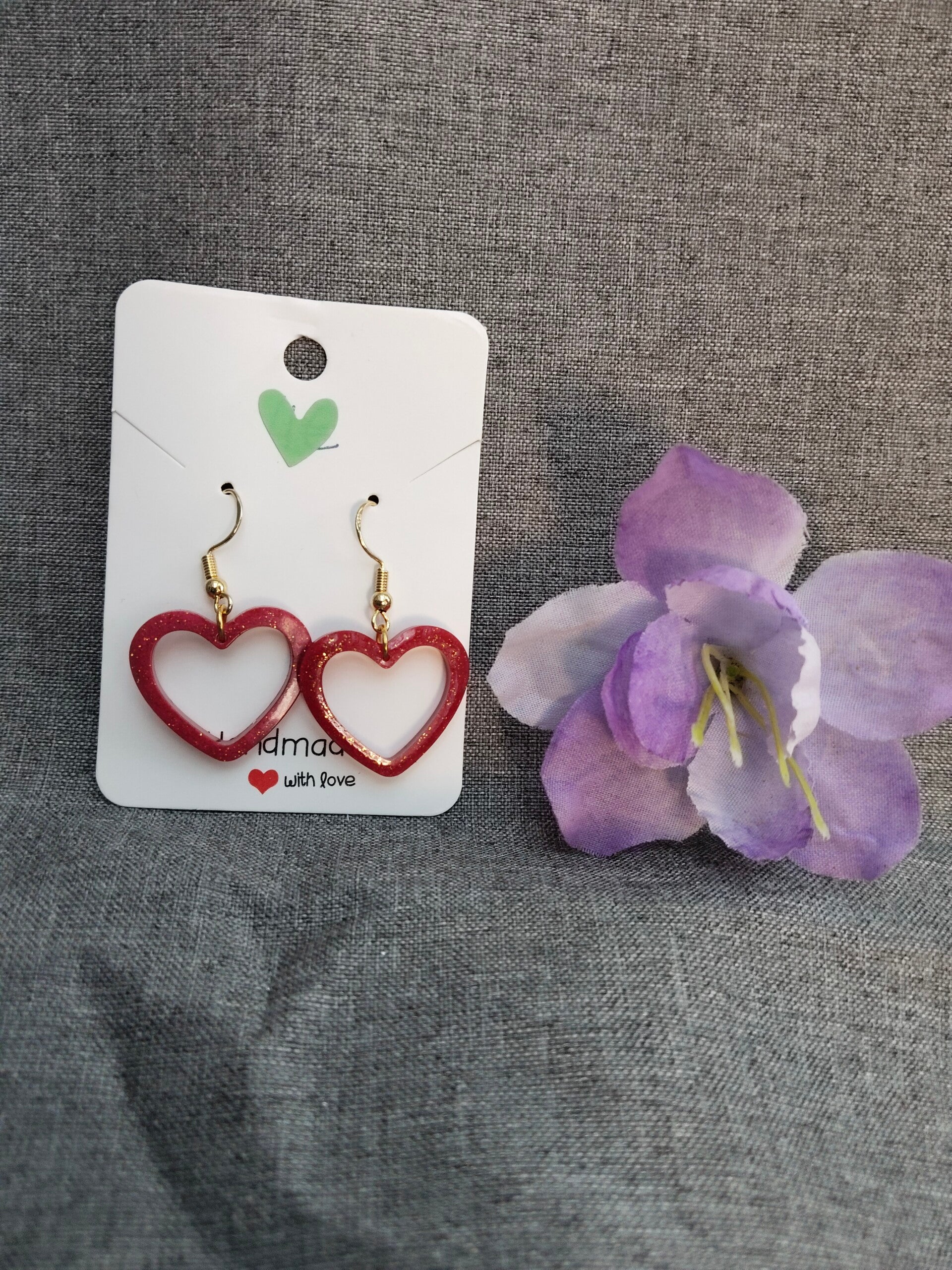 Dezente schöne Herz-Ohringe mit Harz in rot/gold Glitter gegossen, Größe 2cm, Ohrhaken aus vergoldeten Edelstahl.