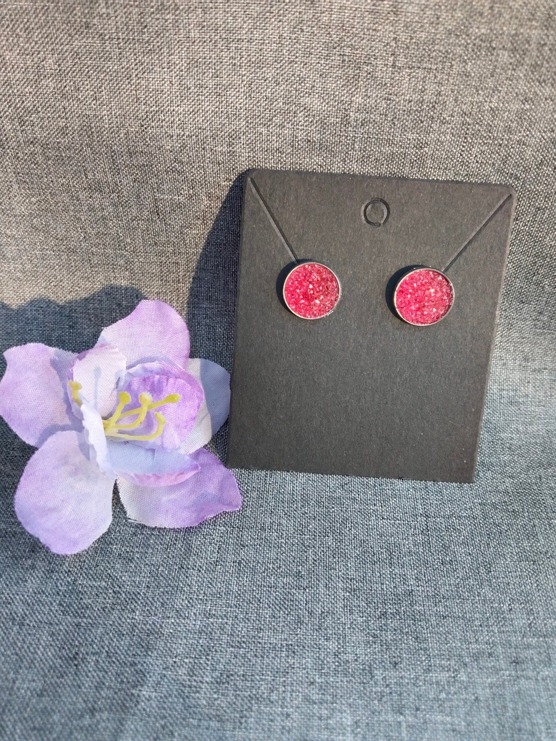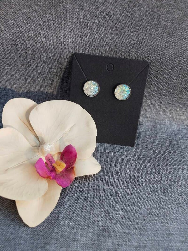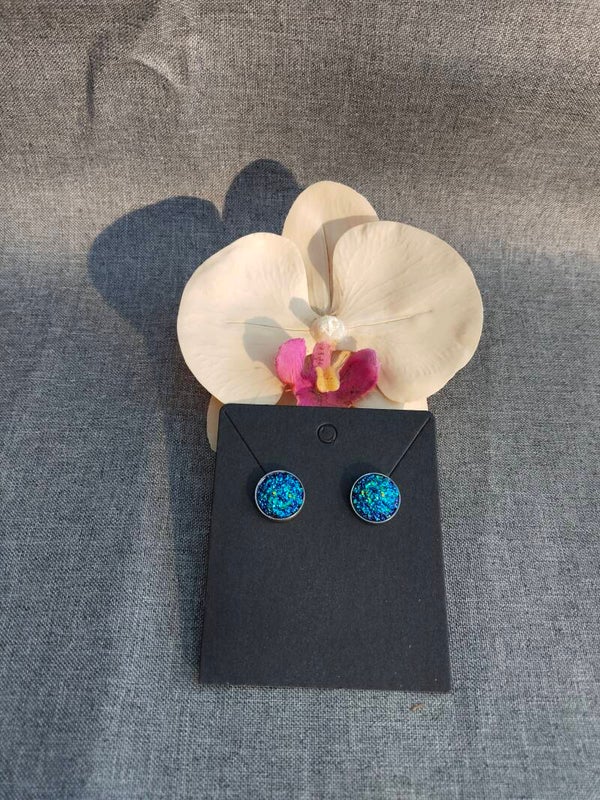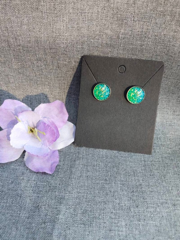 Ohrstecker bestehen aus Edelstahl in der Größe 12mm, eingefasst sind Glitzer-Halbkugeln in verschiedenen tollen Farben.