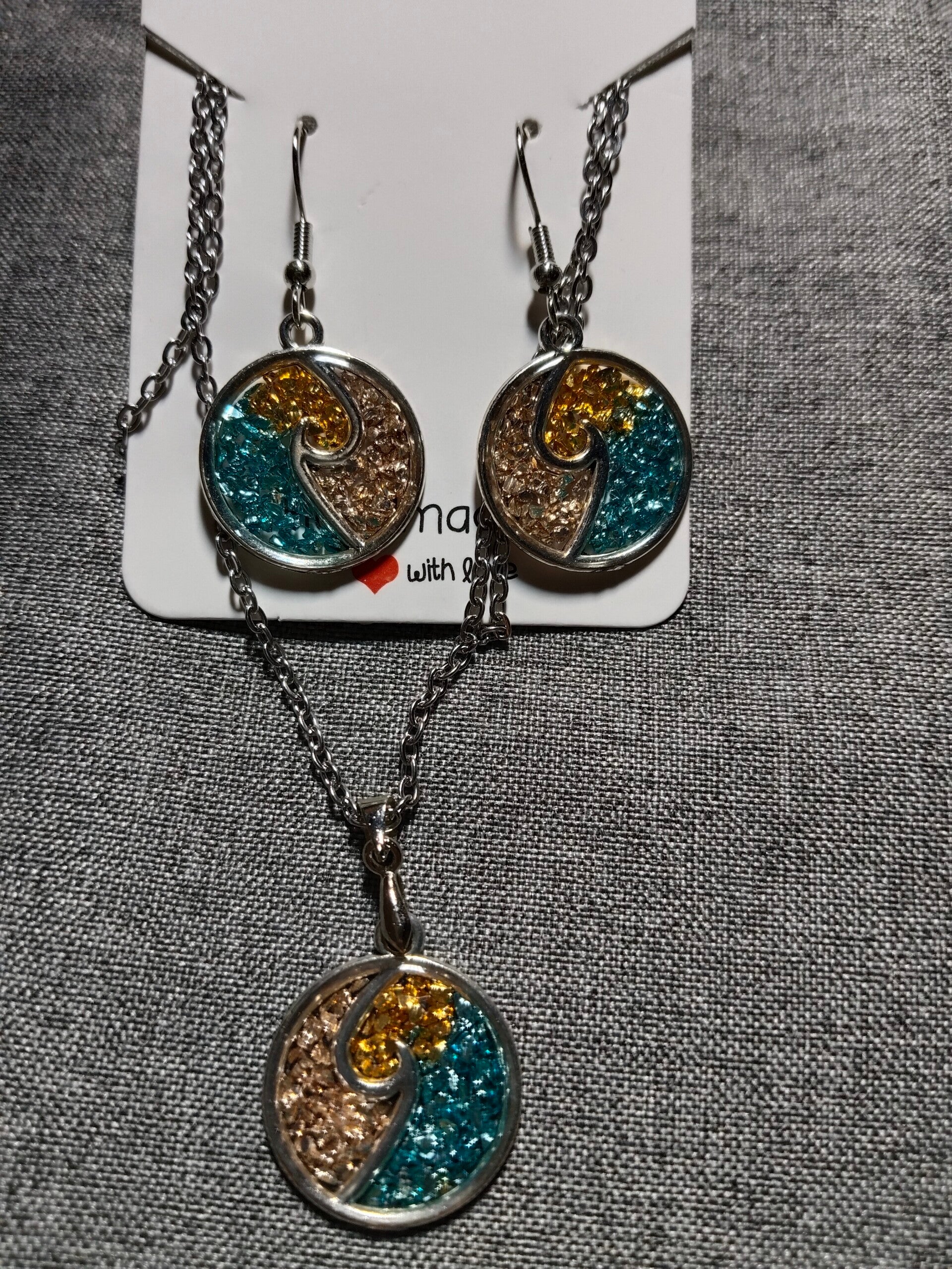 Tolles Schmuckset bestehend aus Ohrringe und Halskette, Fassungen und Kette aus Edelstahl, Länge der Kette ca. 45 cm + 5 cm, runde Fassung ca. 1,8 cm Durchmesser, gegossen aus Kunstharz mit Glassteinen dreifärbig (rose, gold, türkis).