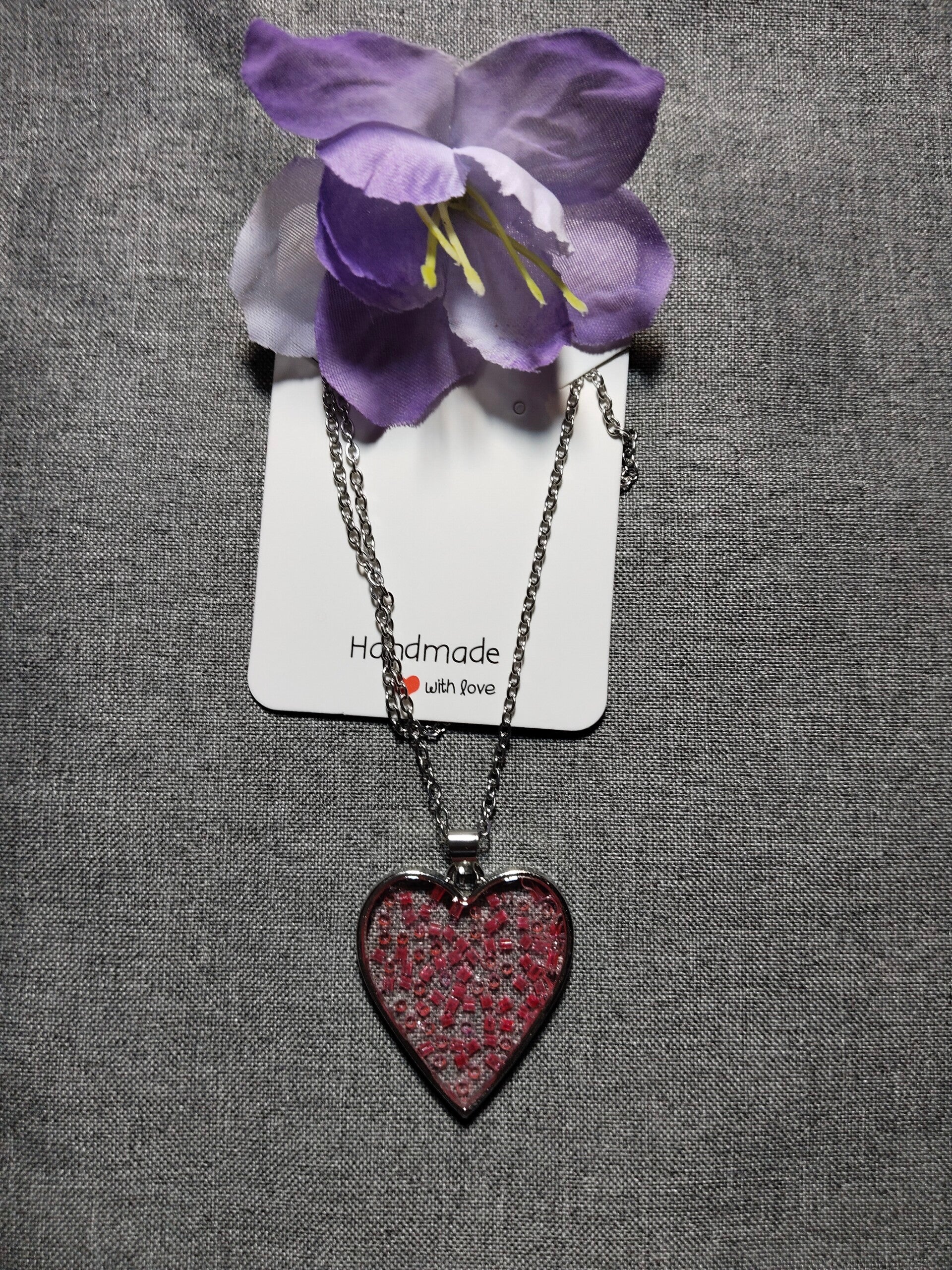 Edle Halskette mit Edelstahlanhänger in Herzform 3,5 cm lang, Länge der Kette ca. 45 cm + 5 cm, Anhänger aus Kunstharz gegossen mit Mini-Glasperlen.