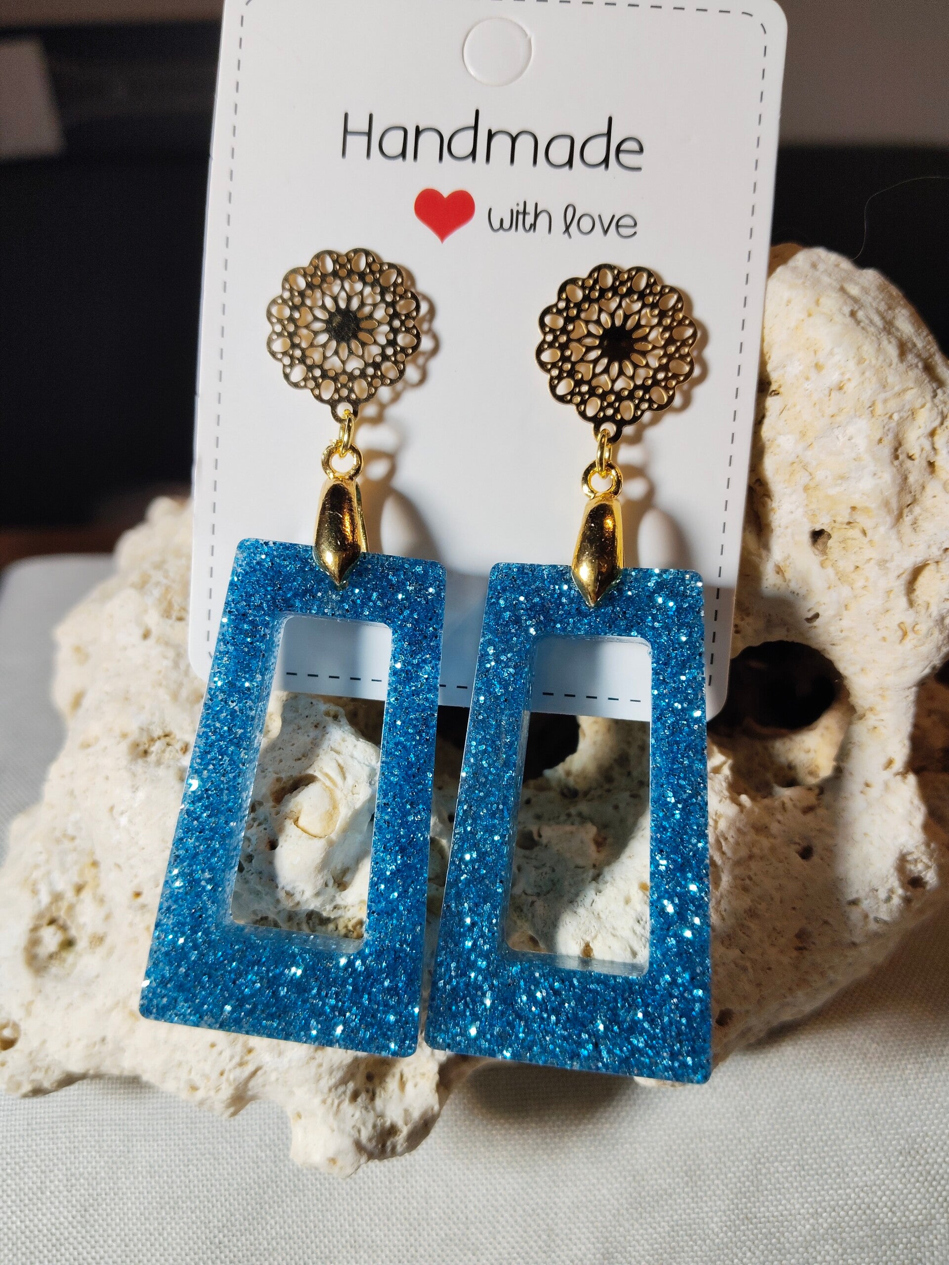 Setzen Sie ein strahlendes Statement! Diese einzigartigen, handgefertigten Hängeohrringe kombinieren leuchtendes Ozeanblau und glitzerndes Silber in einer eleganten rechteckigen Form. Das filigrane, goldfarbene Oberteil in Blütenform rundet den Look ab. Perfekt für einen glamourösen Auftritt oder als besonderes Highlight im Alltag.
