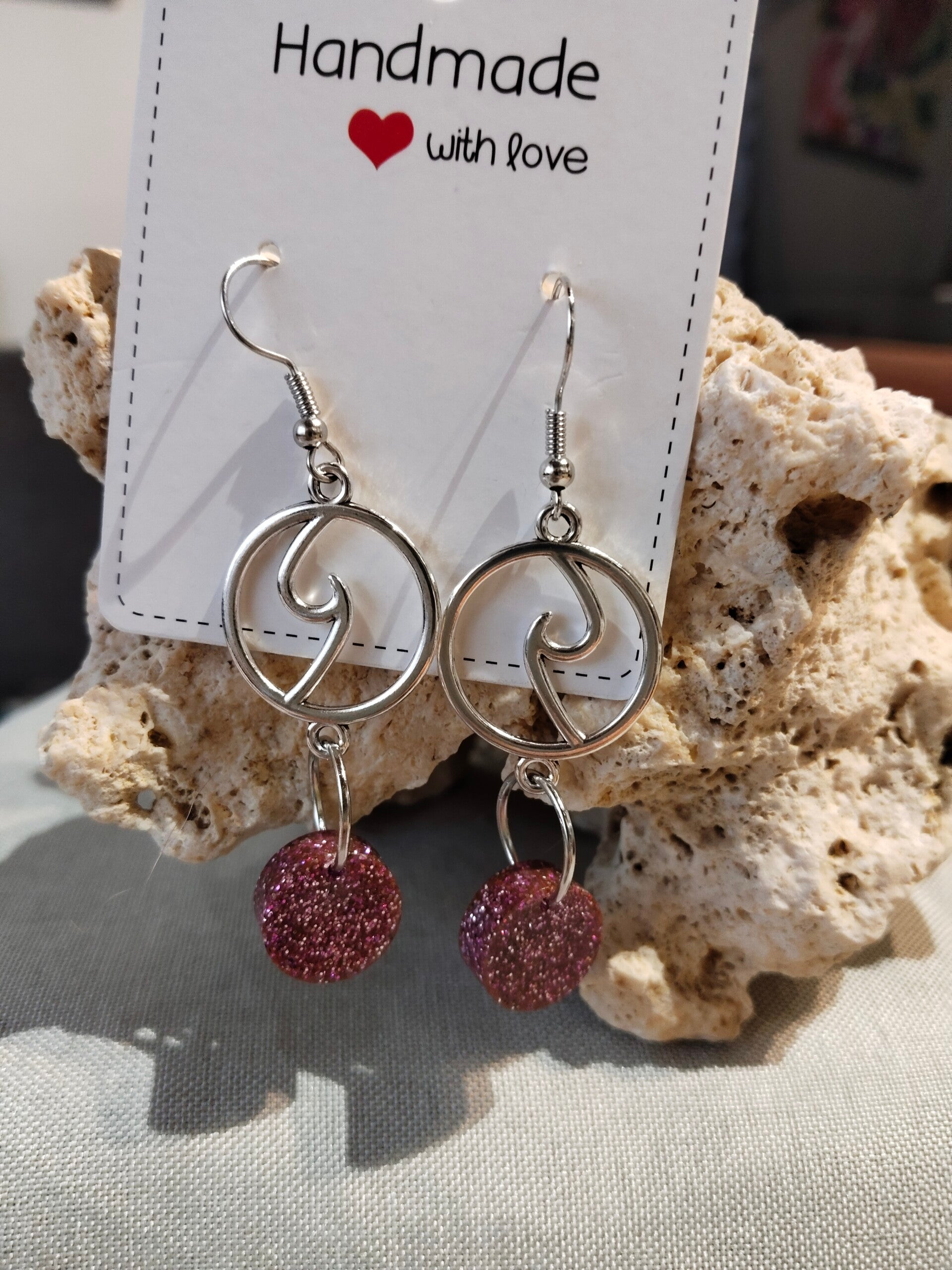 Verleihen Sie Ihrem Look einen Hauch von handgefertigtem Glamour mit diesen einzigartigen Ohrhängern. Das ansprechende, silberfarbene Wellen-Motiv fängt das Licht ein, während die runden, glitzernden Anhänger in Violett/Pink für einen funkelnden Blickfang sorgen.
